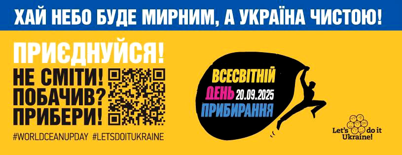 20 вересня 2025 року Україна стане частиною міжнародної ініціативи «World Cleanup Day», до якої приєднаються мільйони людей з 211 країн. Громадяни міст, сіл та селищ об’єднаються для очищення навколишнього середовища від сміття та створення культури чистоти. У 2024 році акція зібрала понад 404 тисячі учасників, які прибрали більше 26 тисяч локацій у 24 областях України, включаючи наших співвітчизників за кордоном. Згідно з міжнародним рейтингом, Україна зайняла 11 місце серед 211 країн-учасниць.